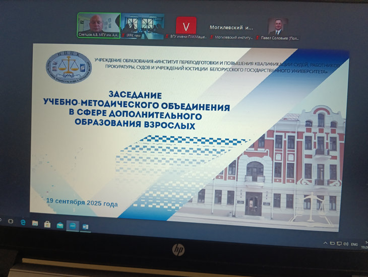 19.09.2025 года, декан факультета экономики и права, кандидат юридических наук, доцент А. В. Слепцов, принял участие в заседании учебно-методического объединения в сфере дополнительного образования взрослых по группе специальностей 0421 «Право» при учреждении образования «Институт переподготовки и повышения квалификации судей, работников прокуратуры, судов и учреждений юстиции Белорусского государственного университета», которое состоялось в онлайн-режиме.