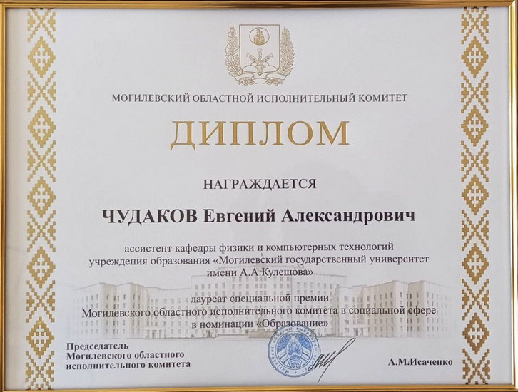 17 сентября 2025 г. в Музее Славы Могилевщины состоялось торжественное вручение специальной премии Могилевского областного исполнительного комитета в социальной сфере доценту кафедры физики и компьютерных технологий, кандидату физико-математических наук Чудакову Евгению Александровичу.