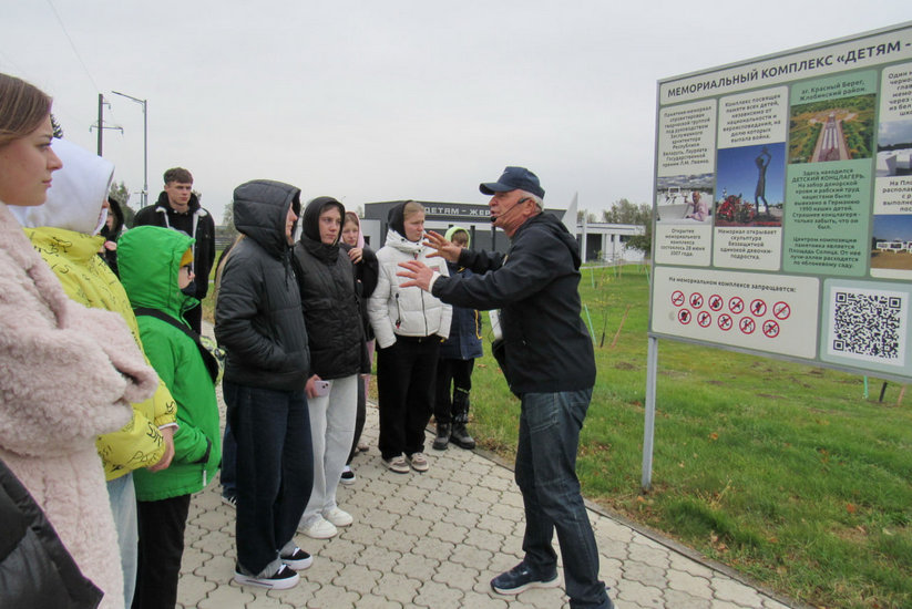 В агрогородке Красный Берег, студенты прикоснулись к трагическим страницам истории, связанными с судьбами белорусских детей в годы войны. Немыми свидетелями украденного детства стали пустой школьный класс и скульптура девочки — как олицетворение расстрелянного детства. У памятника студенты возложили цветы и почтили память невинно замученных детей, ставших жертвами войны. Экскурсия по мемориалу, где воплотилась боль растерзанного детства, продолжилась в музейной экспозиции «Детям — жертвам войны». Здесь участники смогли увидеть фотографии и личные вещи детей счастливого довоенного и опаленного войной детства, познакомиться с историями юных белорусов, проявивших мужество и стойкость в подполье и партизанском движении.